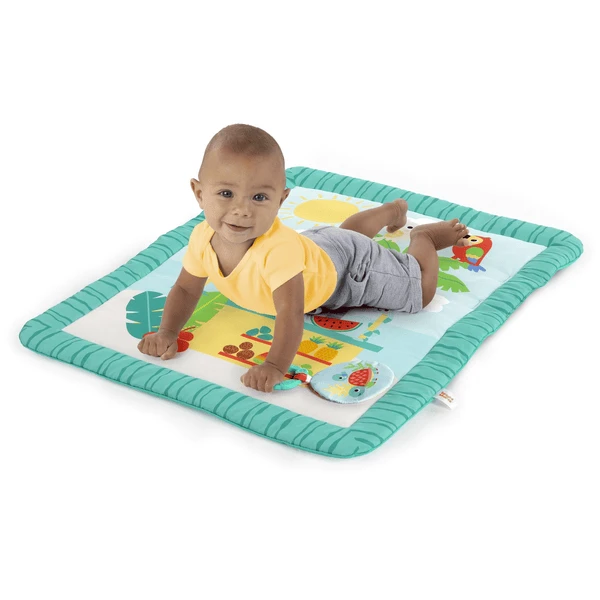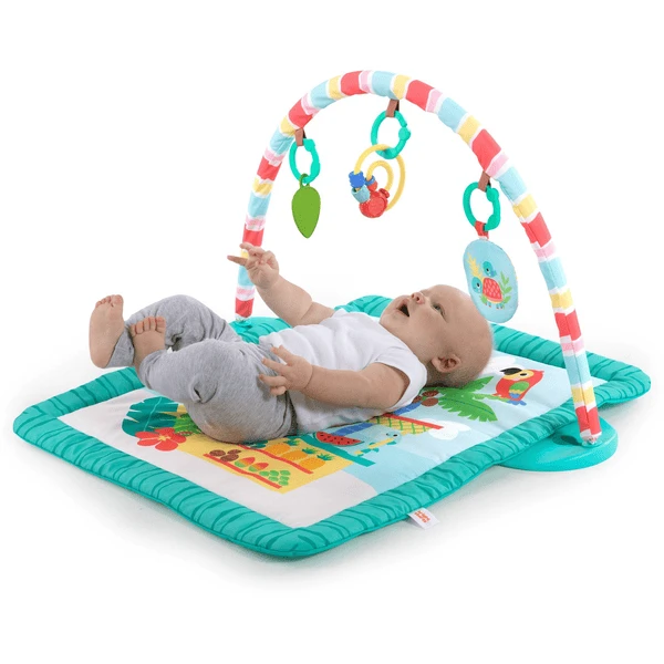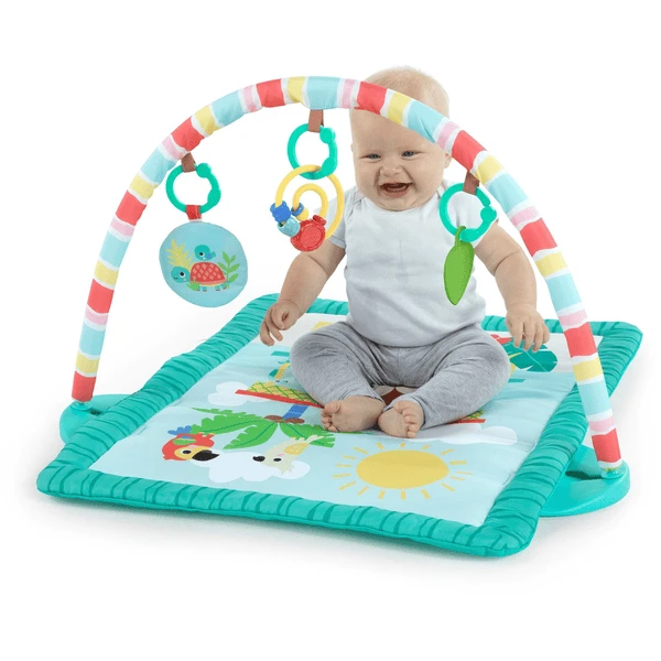 Er zijn 3 speelmogelijkheden: In buikligging, liggend of zittend! Speelgoed bungelt aan de overkapping met speelgoedstang waar baby liggend of zittend bij kan. Oefen de fijne motoriek met het kraalzoekspeeltje, raak en knijp in het kreukelmedaillon en verken elk detail van het getextureerde bladspeeltje.