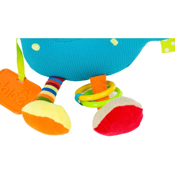 Het lichaam van de dinosaurus is gemaakt van zachte geborduurde stof en vrolijke kleuren.De buik heeft ook een rammelaar van kralen. Door aan het blad op de mond te trekken, gaat de dino hilarisch trillen. Als je in zijn staart knijpt, zal hij piepen. De ene voet heeft een rammelaar, de andere een bijtring en een pucker.