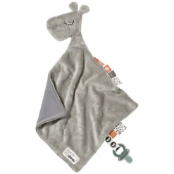 De jongste kinderen hebben al veel plezier met de Raffi knuffeldoek. De kleintjes kunnen vriendschap sluiten met Raffi de giraf en veel verschillende texturen ontdekken. De klittenbandsluiting houdt de fopspeen bij de hand, zodat hij niet verloren kan gaan. Deze knuffeldoek komt bij u thuis in een neutrale grijze kleur.