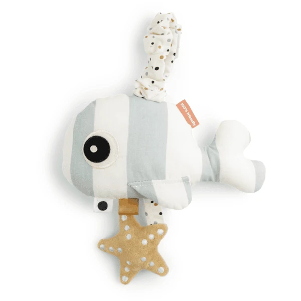 De gestreepte Wally heeft een verborgen bel en kan met een elastiekje naar beneden worden getrokken. De babyset Sea friends is uitgevoerd in zachte tinten blauw en grijs en een warm mosterdgeel.