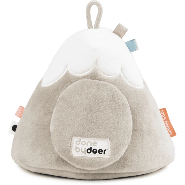 De berg en de kleine Activity speeltjes zijn in een zacht beige, blauw en groen met enkele koraalrode kleurspatten.