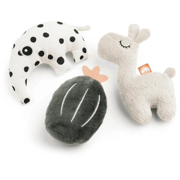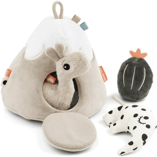 Ze kunnen de verschillende texturen voelen, naar de belgeluiden luisteren en de kleurrijke etiketten verkennen. De kleine lama speelt graag verstoppertje met Antee de miereneter. Het deurtje kan worden gebruikt om de berg te sluiten en de zachte cactus ritselt als je erop drukt. Een lus tiger babyspiegel verstopt zich onder de besneeuwde berg.
