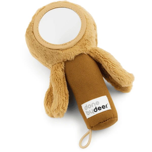 Het spiegeltje op de achterkant is bijzonder opwindend voor baby’s. De zachte armen van de gelei rammelaar knisperen vrolijk als kleine handjes ze verkennen. Het handvat is gemakkelijk vast te pakken en piept als je erop drukt.