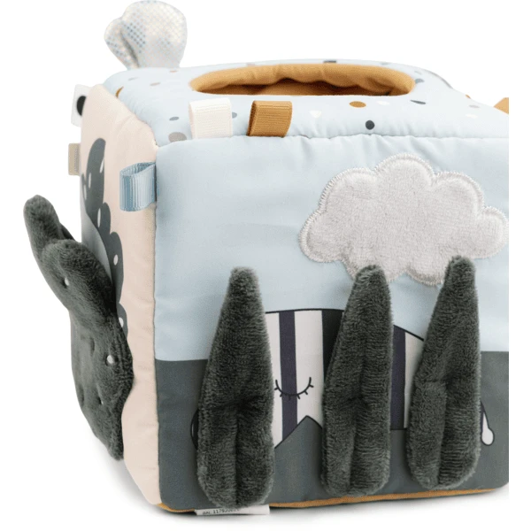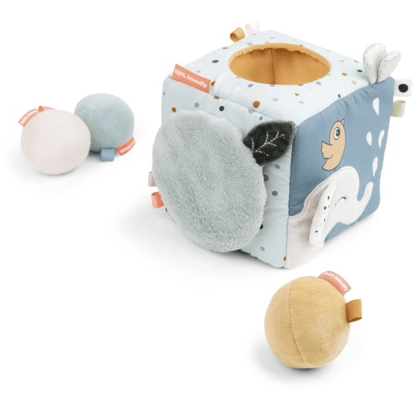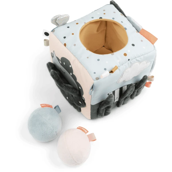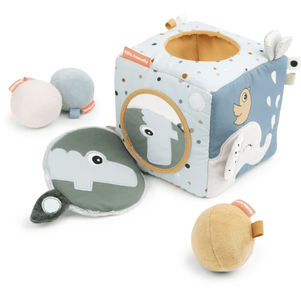 Het heeft zachte kleuren en biedt veel spannende en stimulerende activiteiten. Ruisende bladeren, een zacht babyspiegeltje, Croco die zich achter de deur verstopt en vele andere leuke details kunnen ontdekt worden tijdens het dobbelen. Laat uw kind zijn kleine schatten of de drie rammelaarballen in de kubus stoppen.