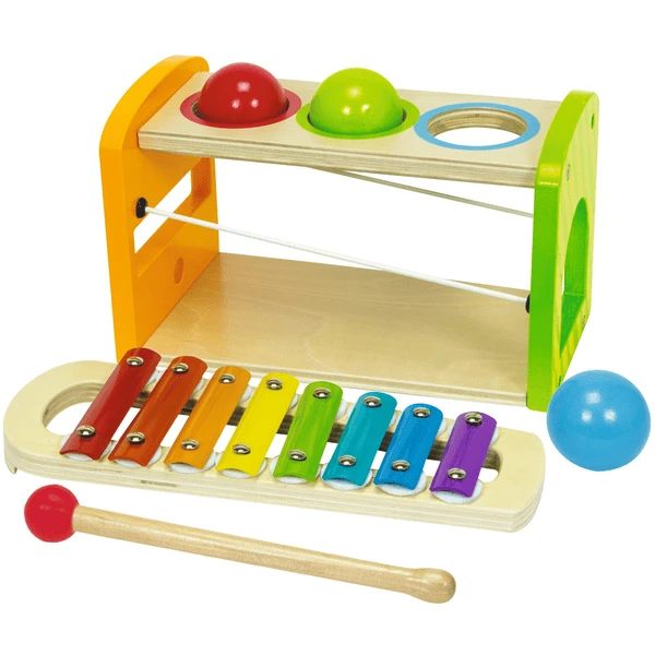 De xylofoon van Eichhorn produceert harmonieuze geluiden en draagt bij tot de positieve ontwikkeling van de auditieve perceptie van het kind. De volgorde van de afzonderlijke tonen wordt door verschillende kleuren gemarkeerd. Kinderen moeten deze onthouden om herkenbare melodieën te kunnen spelen. De xylofoon kan onafhankelijk van de hamerbank worden bespeeld. De 5-delige set bestaat uit de 12,5 x 25 x 12 cm hamer-ballenbank met 3 gekleurde gaten, 3 gekleurde ballen en een meegeleverde hamer. Geschikt voor kinderen vanaf 2 jaar.
