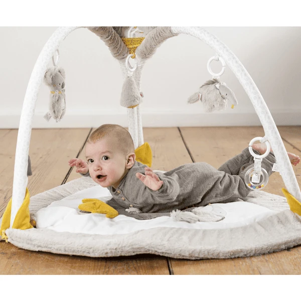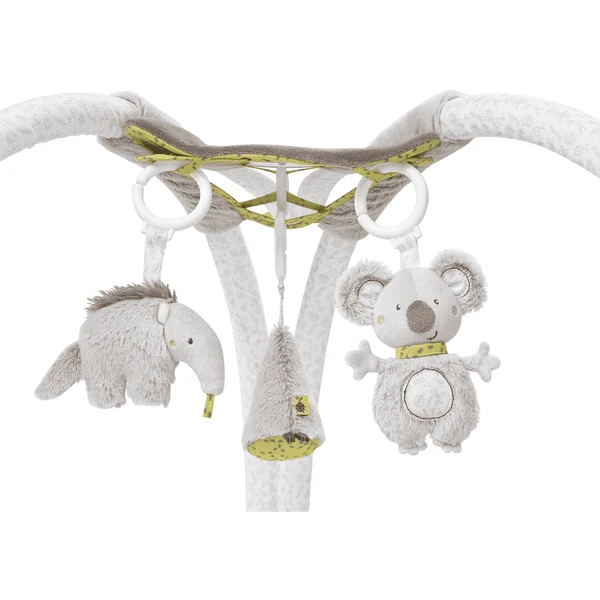 Het leuke speelgoed die aan de bogen hangt is makkelijk te grijpen door babyhanden en makkelijk te bereiken. Dit bevordert de tastzin en de hand-oog coördinatie. De miereneter met pieper, de koala met rammelaar, de kegel met klok, en de ring rammelaar van kleurrijke kralen. Allen wekken zij de baby’s nieuwsgierigheid op met geluid en zorgen ervoor dat het leert omgaan met zijn omgeving.