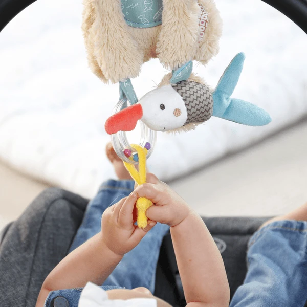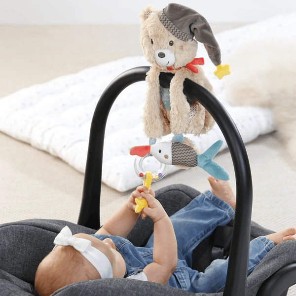Altijd bij je – de charmante Activity Bear uit de Bruno collectie laat de ogen van je baby stralen. Hij is een knuffel, vriend, beschermer en speelmaatje in 1 en wordt al snel de eerste beste vriend van je baby. Bruno straalt zijn eigen charme uit met een grote slaapmuts, buikzak en nekdoekje. Op zijn handen is er ook nog leuk speelgoed: De rammelaarring met gekleurde parels geanimeerd om te rammelen, te schudden en te spelen. Daarbij bewegen de kleurrijke kralen in hun buis op en neer. Dit ondersteunt de motoriek en geeft veel plezier. De zaagvis Sammy verrast met klokken en verborgen ritselgeluid. Dit wekt de nieuwsgierigheid van de baby en stimuleert op speelse wijze de zintuigen. De ongewone vorm en de verschillende materialen van de vissen zorgen voor een geweldige ’touch and feel’ ervaring. Naast zijn speelfuncties overtuigt Bruno ook met zijn hoge knuffelfactor. De pluizige vacht van knuffelzacht pluche en zijn knuffellichaam nodigen uit tot voelen en knuffelen. Dankzij zijn vorm zorgt Bruno voor het beste entertainment voor onderweg. Het is snel bevestigd aan kinderwagens en autostoelen met klittenband en ziet er prachtig uit.