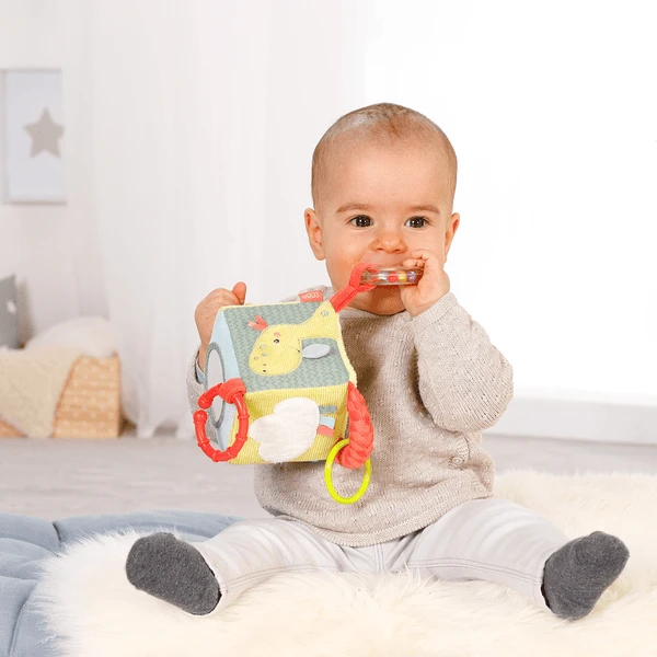- Baby kan zichzelf spelenderwijs ontdekken in het spiegeltje en grappige geluiden maken met de rammelaar en bel op de veelzijdige speelgoedkubus