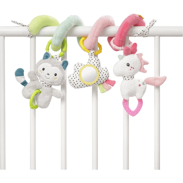Eerste ontdekking en spelplezier: Met de Activity – Spiral e Aiko & Yuki is een goed humeur gegarandeerd! De opgezette dieren l aden met de kleurrijke mix van functies en kleuren om te observeren, te spelen en te grijpen. Rammelaar en grijpring in de kat, dierenstem en spiegel in de wolk, piepen en zacht bijten in de eenhoornentrein en helpen bij het doorkomen van de tandjes. Snel en flexibel aan de autostoel, kinderwagen, bed of box bevestigd – zo wordt elk avontuur een belevenis en geen ritje vervelend!
