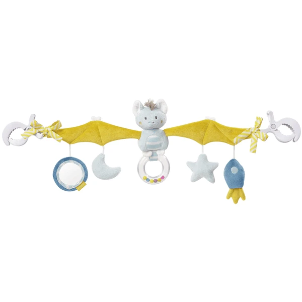 Makkelijk om te grijpen, bevat kleurrijke parels in regenboogkleuren die het kindje nieuwsgierig maken en animeert tijdens het schudden en spelen. Bovendien rammelen de kleurrijke parels door elkaar. Kleine ontdekkers worden snel begrijpen hoe dat gaat. De rammelende raket, de piepende ster en de ruisende maan trekken de aandacht van de baby met geluiden. In de afneembare spiegel kan je baby op spelenderwijs zichzelf ontdekken. Twee witte klemmen maken een eenvoudige en flexibele bevestiging van de kinderwagenketting aan babyzitje, kinderwagen, kinderbox en kinderbedjes mogelijk.