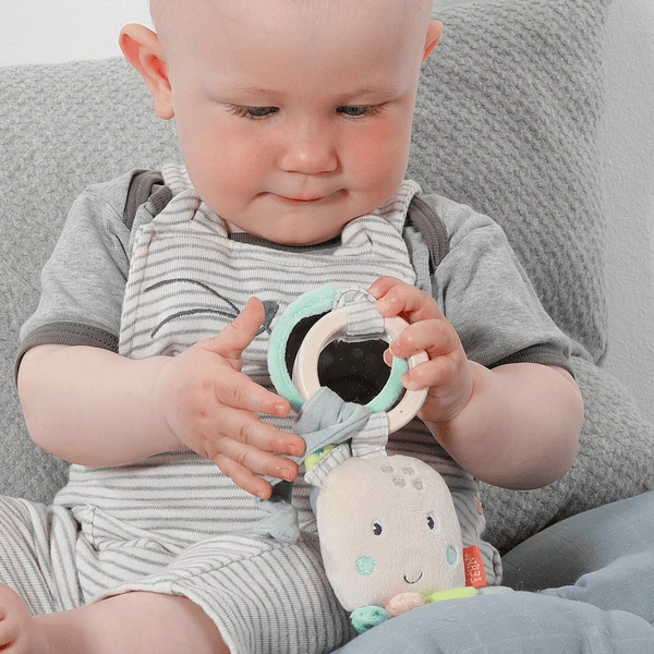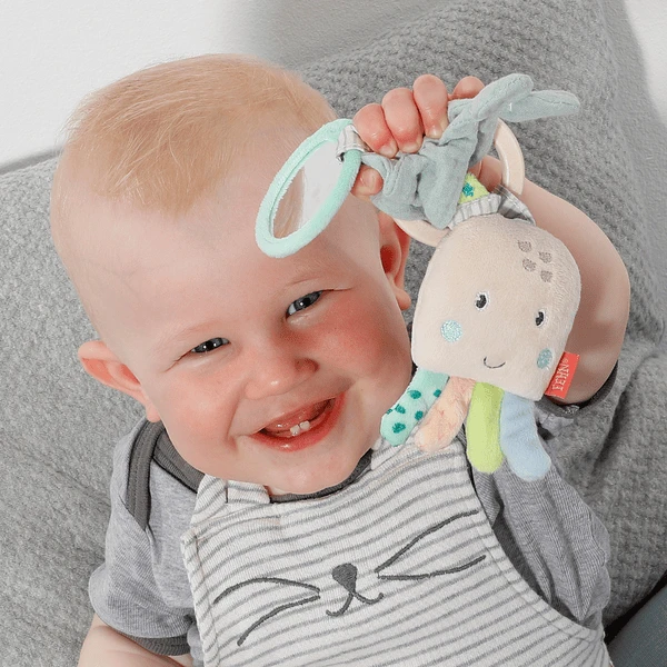 Kleine ontdekkingsreizigers zullen de grote grijpring snel in hun hart sluiten en hem overal mee naartoe nemen als trouwe metgezel – thuis of onderweg, in het babyautostoeltje of de kinderwagen.