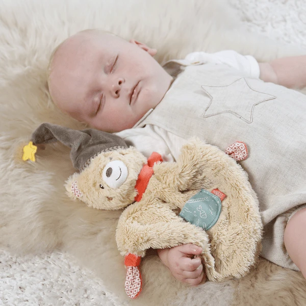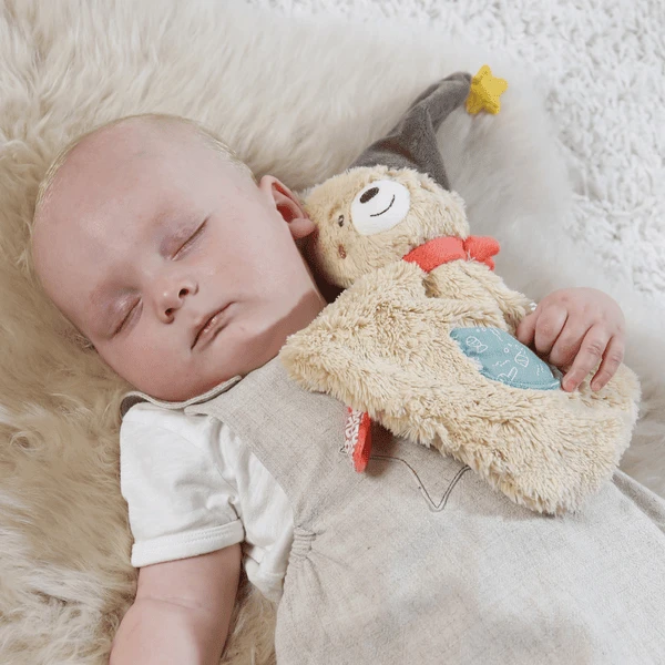 Met een buikzak, een slaapmuts en twee knopen nodigt het knuffelzachte knuffeldoek in driehoekige vorm je uit om uitgebreid te grijpen, te voelen en te zuigen. De schattige beer helpt je in slaap te vallen, begeleidt dag en nacht kleine wereldreizigers en wordt al snel je eerste beste vriend.