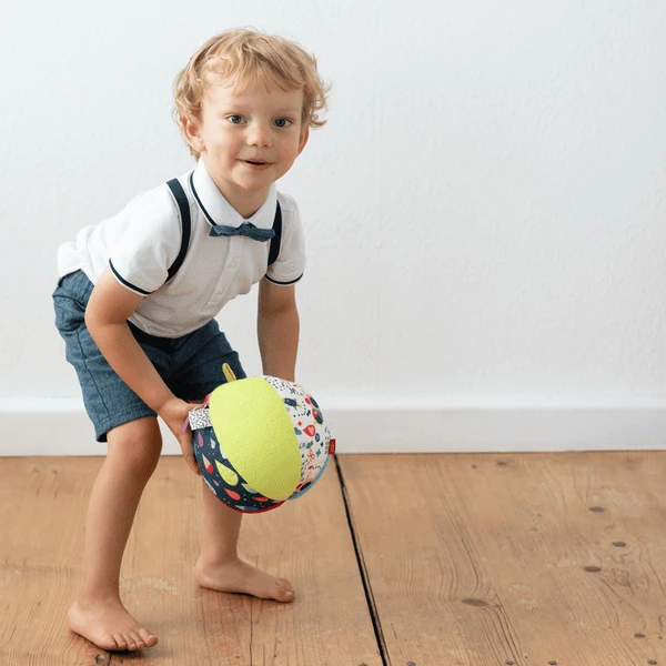 Motorische activiteit speelbal met materiaalmix & kleine belletjes voor het gooien, grijpen, rollen, bevordert de motoriek van de baby, voor baby’s en peuters vanaf 0+ maanden — Rollen, schudden, drukken – met de softbal leert de COLOR Friends baby de wereld te grijpen door te spelen. Als de grote, kleurrijke speelbal heen en weer rolt en de bel vrolijk rinkelt, volgen de ogen van de baby hem met spanning. De contrastrijke stoffen bal ondersteunt op speelse wijze de beweeglijkheid, de hand-oogcoördinatie en de motoriek van de baby door de eerste pogingen tot kruipen, gooien en vangen. De spannende materiaalmix van zacht velours, bouclette, badstof & bedrukte stof stimuleert het gevoel van aanraking, doelgericht grijpen en nodigt uit tot verkennen, grijpen en spelen. Met de opwindende Activity – bal, is samenspelen gegarandeerd niet saai.