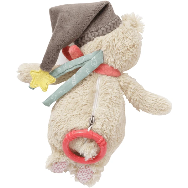 te knuffelen. Trek simpelweg aan de rode ring van de beer en een betoverende melodie klinkt op een aangenaam volume. Je baby wordt rustig, getroost en in slaap gewiegd. Het mechanisme kan worden verwijderd door de veiligheidsrits te openen met een paperclip. Als knuffeldier of hulp om in te slapen. De betoverende beer is een echte blikvanger thuis en onderweg en wordt het eerste maatje van je baby. Met twee riemen is hij snel bevestigd aan kinderwagens, reiswiegen en bedjes.