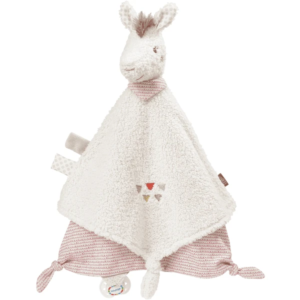 Het schattige knuffeldoekje met lamakoppen uit de Peruaanse collectie is een troostende, verwarmende, slaapmiddel en knuffelvriend in één en wordt een trouwe metgezel, zowel thuis als op reis. De praktische bevestigingsring zorgt er ook voor dat de fopspeen niet verloren gaat bij de grootste avonturen! Als je in slaap valt, is de knuffeldeken een echte hulp – overdag zijn aden de zachte materialen, het hoofd en de aangenaaide uiteinden zo zacht dat je ze kunt grijpen, voelen en knuffelen, zodat de schattige lama niet snel uit je hand zal worden losgelaten.