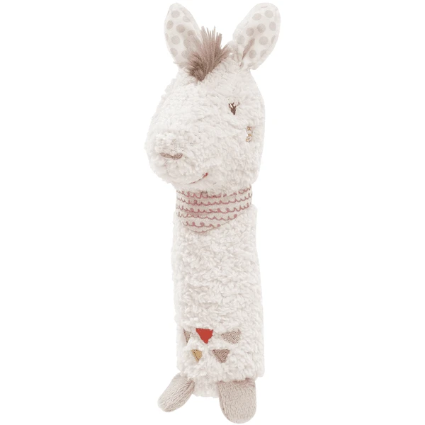 De Lama hengelgrijper uit de Peruaanse collectie kan worden gegrepen, gevoeld, gekletterd en gepiep, waardoor de interesse van de baby wordt gewekt en hij wordt uitgenodigd om te ontdekken en te onderzoeken. De stick rammelaar met pieper bevordert het gehoor, de tastzin en de fijne motoriek van de baby en is daarom ideaal als geschenk voor de geboorte, de doop of de verjaardag. Kleine ontdekkingsreizigers nemen de schattige lama snel mee in hun hart en nemen hem overal mee als trouwe metgezel – thuis, onderweg, in het autostoeltje of in de auto!