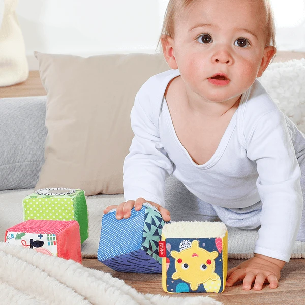 Motorische activiteit speelgoed kubus set voor het ontdekken, stapelen, spelen & maken van geluiden – bevordert het vroege leren & motorische vaardigheden bij baby’s vanaf de geboorte — Met de spannende stoffen kubus set uit de COLOR Friends collectie leren baby’s op een speelse manier nieuwe dingen te ontdekken & (vast te pakken). De vier leerblokjes hebben elk hun eigen kleur en geluid: de rode appelblokjes rammelen, de blauwe kattenkubus knappert, de gele zonnekubus twittert en de groene spiegelkubus ringen. Dit ontwaakt de ontdekkingsgeest van de baby en ondersteunt de ontwikkeling van de zintuigen in de vroege kinderjaren. De kubussen zijn voorzien van een bijzonder zachte materiaalmix en zijn perfect geschikt voor kleine babyhandjes, zodat ook het tastgevoel en het doelgericht vastpakken op een speelse manier worden getraind. Met deze kubussen is het ontdekken, spelen en stapelen twee keer zo leuk en tegelijkertijd worden de motorische vaardigheden bevorderd – baby’s zullen de kubusenset geweldig vinden!