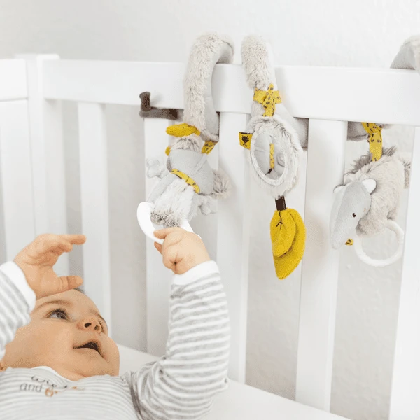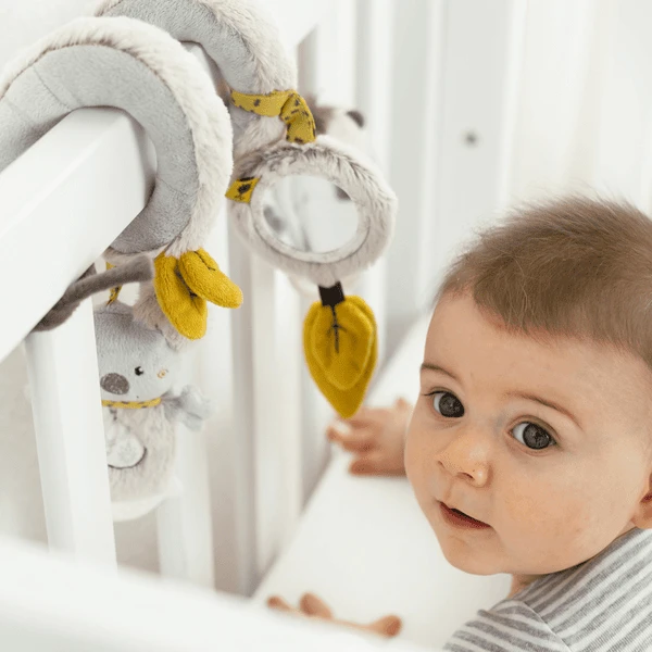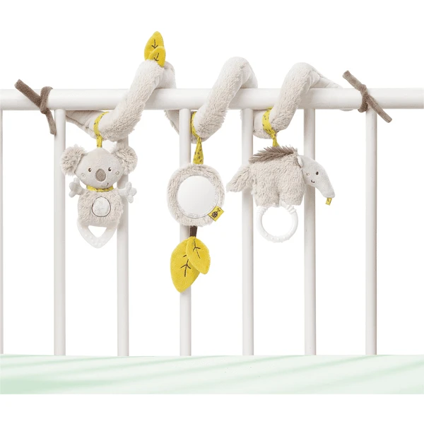 De knuffelige koala en zijn vriend de miereneterhebben zich uit de Australische outback gerept om het hart van je kleintje te veroveren. Met drie schattige aanhangers die vrolijk heen en weer bewegen. De miereneter met rammelaar en grijpring en twee bladeren met knisperpapier nodigen uit om te grijpen en te spelen en het trainen van eerste hand-oog coördinatie De koala met geluid bevordert het grijpen. In de kleine spiegel kan je baby zichzelf op speelse wijze ontdekken. De spiraal wordt eenvoudig om de autostoel, kinderwagen, loopstoel en bedje gebonden en zorgt voor plezier voor iedereen! De drie figuren laten zich heen en weer wiebelen en kunnen bij het bevestigen veranderd worden.