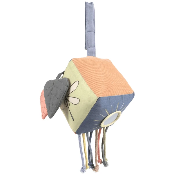 Activiteiten speelgoed geïnspireerd door de Scandinavische natuur, gemaakt van 100% biologisch katoen. De zachte kubus is ontworpen met verschillende elementen aan elke kant, waaronder een spiegel, belletje, illustraties, knisperend geluid en verschillende onderdelen die leuk zijn voor baby om aan te raken. Een fijn speeltje dat het zicht en het gehoor van baby stimuleert en ook de fijne motoriek van baby ontwikkelt. Met klittenbandsluiting aan de riem waardoor het activiteitenspeelgoed kan worden gebruikt op onze fijne speelboog, over de luiertafel of op het autostoeltje van het kind.