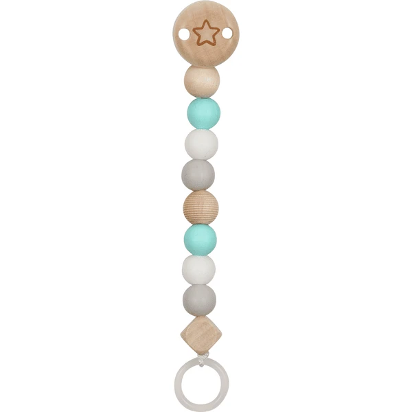 - De fopspeenketting kan gemakkelijk aan de kleding van de baby worden bevestigd, zodat de fopspeen niet verloren gaat