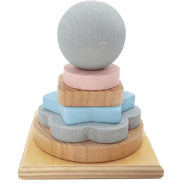 Het op elkaar stapelen van de verschillende gekleurde houten delen van de stapeltoren bevordert de coördinatie en de motoriek van de kinderen. De kinderen leren snel hoe ze op grootte en kleur kunnen sorteren en de toren zelf kunnen bouwen zonder hulp. De kleurrijke kleurstelling maakt het spelen steeds weer leuker.