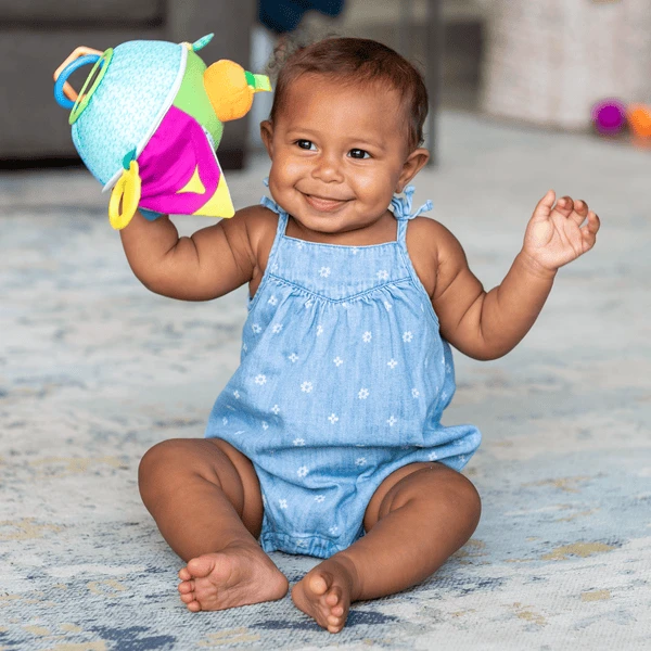 Kleine handjes zullen genieten van het schudden, grijpen en gooien van deze gemakkelijk vast te houden bal. Beweeglijkheid, zoals fruit pellen, ringen klepperen en rammelende geluiden maken, stimuleert de fijne en grove motoriek en de cognitieve vaardigheden van kleine handjes en nieuwsgierige geesten.