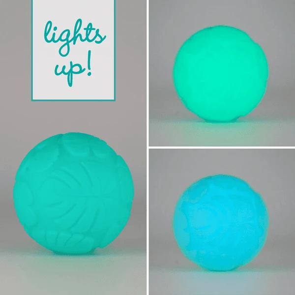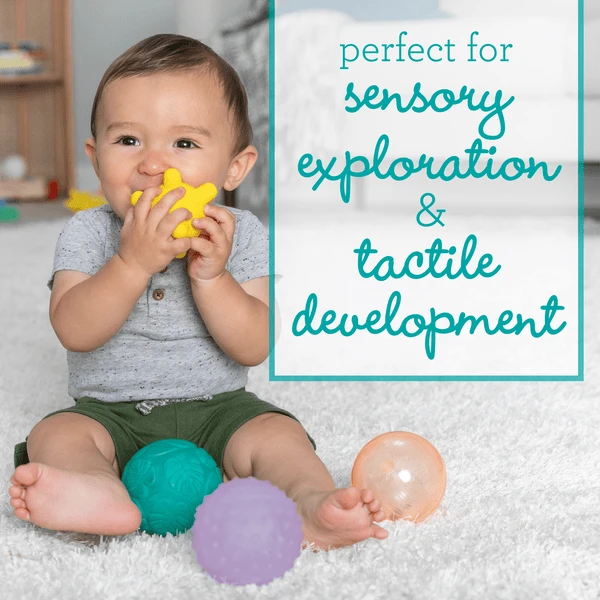 De Sensory Balls zijn bijzonder zacht en passen goed in baby’s kleine handjes. Elke bal heeft een andere structuur en kleur, net als de dobbelstenen. De spuitbeesten kunnen gemakkelijk mee in bad.