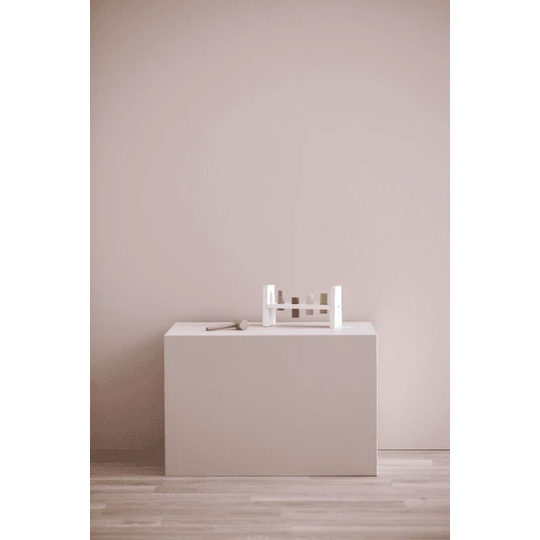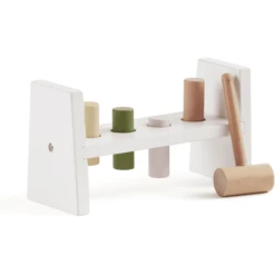 De houten hamerbank biedt plaats aan de hamer en vier natuurgekleurde pinnen. De hamerbank traint de hand-oog coördinatie van je kind, de fijne motoriek en het probleemoplossend vermogen.