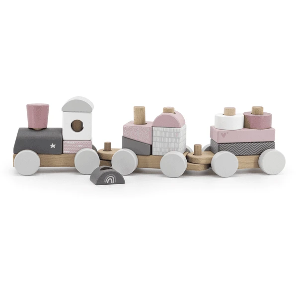 - De Label Label stapeltrein is gemaakt van hoogwaardig FSC-gecertificeerd beukenhout en is gedecoreerd met kindvriendelijke verf op waterbasis met mooie zachte tinten roze, wit en grijs.