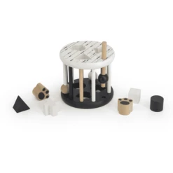 - Steek de verschillende houten vormen in de passende gaten en beweeg de kolom met de bal erop om de vormen eruit te halen en opnieuw te spelen.