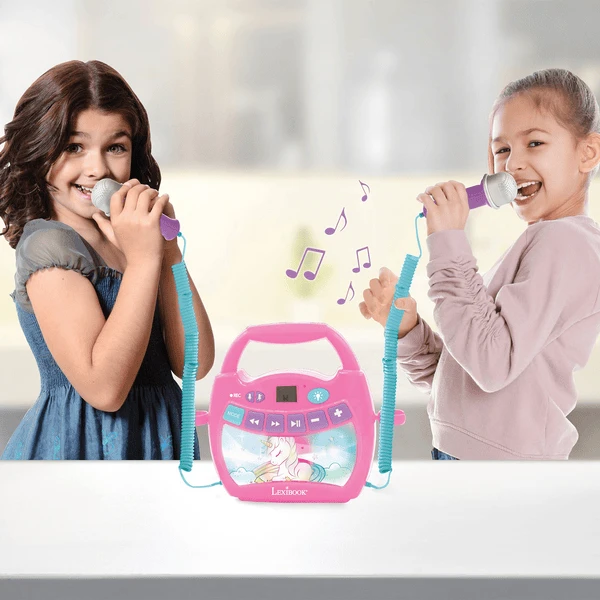 Zing mee met je vrienden met behulp van de twee ingebouwde microfoons en probeer je talenten uit met de drie verschillende spraakeffecten. Verbind uw Smartphone of tablet via Bluetooth met de karaokespeler om naar uw eigen muziek te luisteren en mee te zingen! Dankzij de praktische draaggreep kunt u de speler overal mee naartoe nemen.