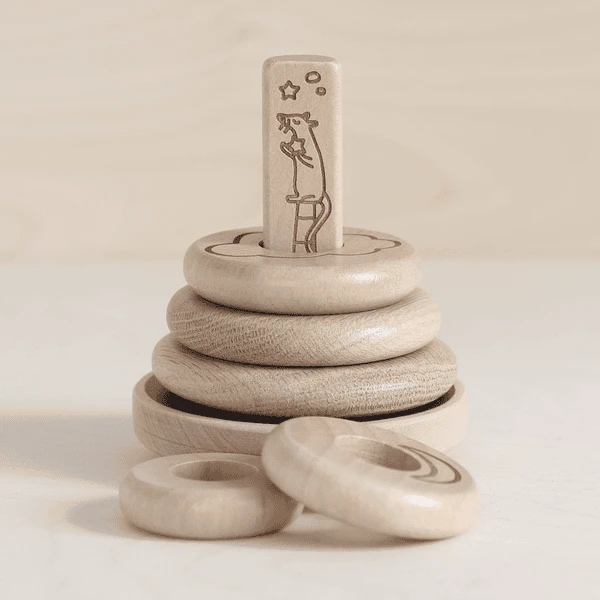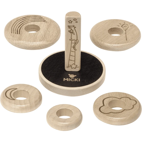 - De premium houten versie van Micki s stapelspeelgoed heeft gegraveerde illustraties van een muisje dat langs de stok klimt.