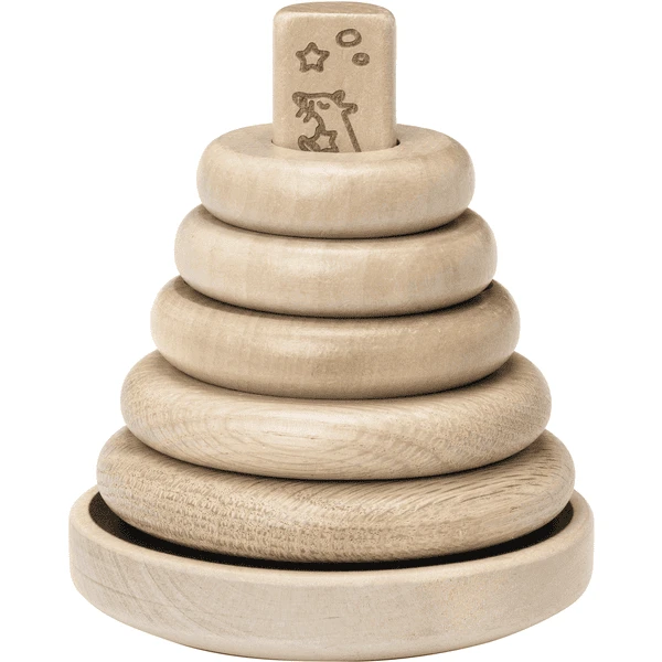 - De ringen kunnen in willekeurige volgorde worden gestapeld terwijl het kind op speelse wijze leert hoe de verschillende maten zich tot elkaar verhouden.