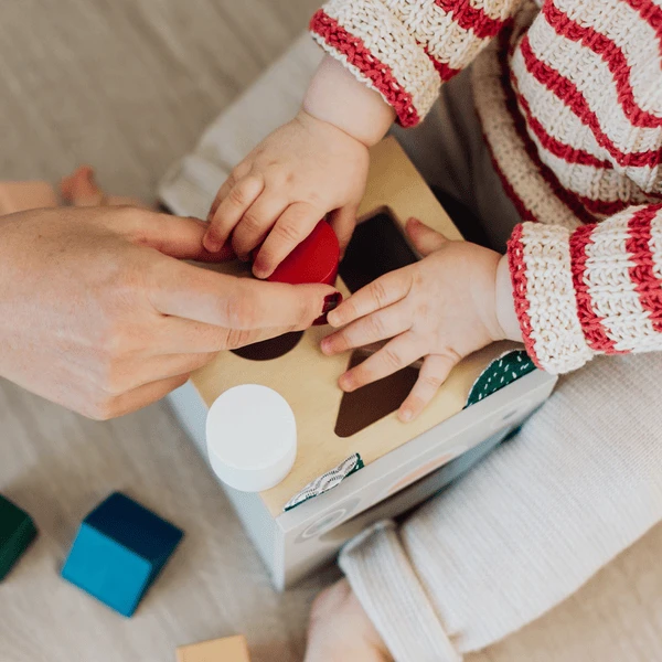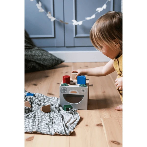 Welke steen hoort in welk gat? En hoe voelen de zachte berenoren aan? Als alle stenen passen, reikt de hand gewoon in de mond van de vriendelijk lachende beer, haalt de stenen er weer uit – en het spel begint weer van voren af aan. De met vilt gevoerde bodem van de doos zorgt ervoor dat de stenen een aangenaam geluid maken als ze vallen. De sorteerdoos bevat zes verschillend gevormde houten stenen.