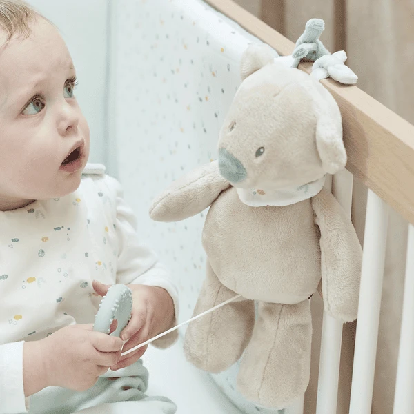 - Let op: Om elk risico op letsel door verstrikking te voorkomen, verwijder het speelgoed zodra het kind probeert op handen en voeten te gaan staan of te kruipen.