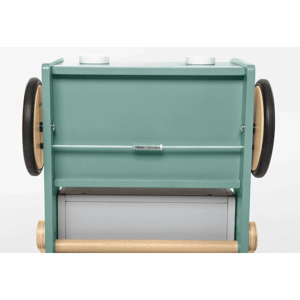 De kiepbak biedt voldoende ruimte voor bouwblokken en ook voor het belangrijkste speelgoed dat nodig is op een ontdekkingstocht.