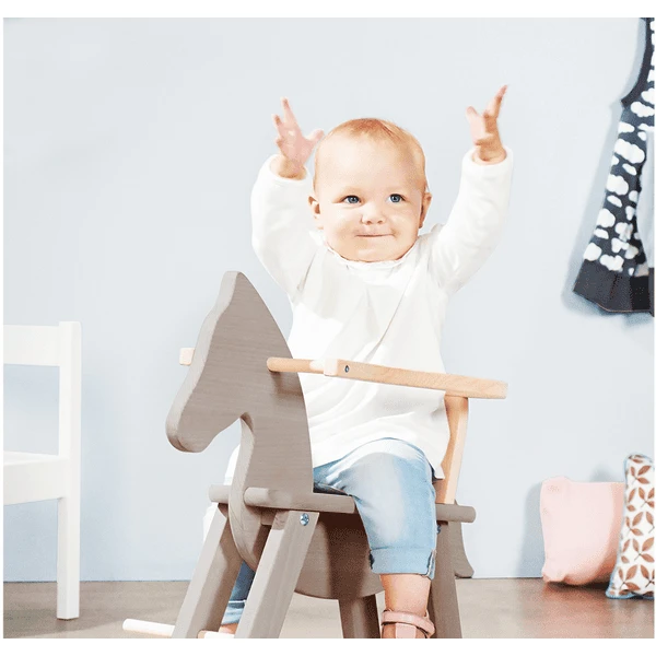 Met een mix uit onbehandeld hout en grijs gelakte vlakken legt het schommelpaard een echte trend.