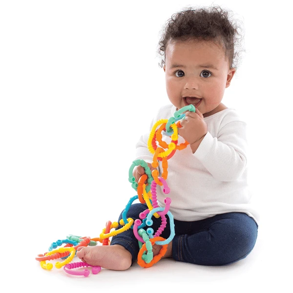 De 24 ringen met bonte kleuren en verschillende structuren kunnen als ketting aan de kinderwagen bevestigd worden. Daaraan bevestigde knuffels, kunnen zo niet meer kwijtraken onderweg. De ringen zijn ideaal om de pijn van doorkomende tanden te verzachten – de structuur masseert het tandvlees.