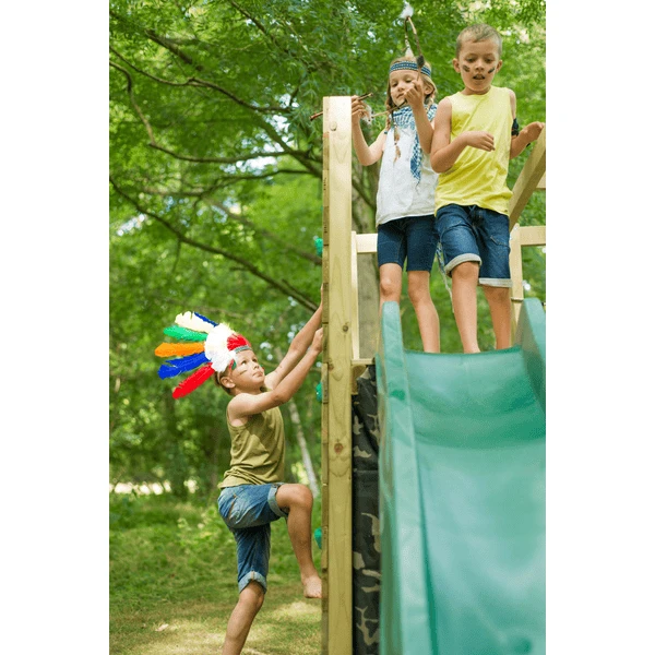 lange glijbaan, een bagagenet, een klimmuur met gekleurde handgrepen, houten