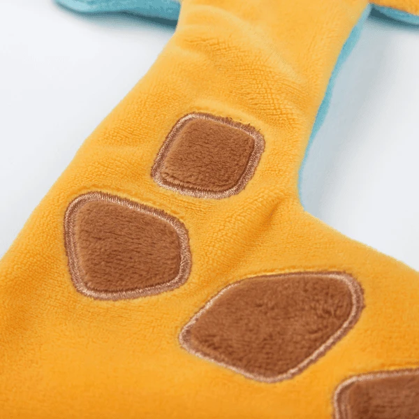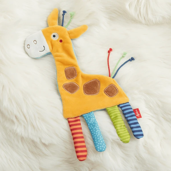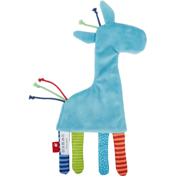 Grote mogelijkheden om te grijpen, te zuigen en te ontdekken worden geboden door de kleurrijke beentjes en de geknoopte korte linten op het hoofd en de staart. De knisperende folie in het dier biedt een bijzondere akoestische verrassing. Het 27 cm hoge knisperdoekje wordt al snel het favoriete speelgoed van de baby tijdens de wakkere uren. De Schnuffeltuch wordt aanbevolen vanaf de geboorte. Zoals gebruikelijk zijn alle stoffen van hoge kwaliteit en bestand tegen veelvuldig wassen in de wasmachine bij 30 °C.