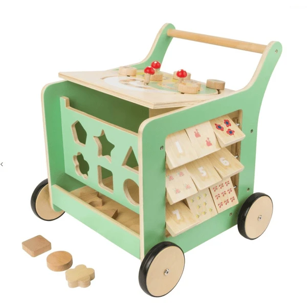 Deze mooie loopwagen is een echt multitalent. Hier kan gekleurd, gestoken en gedraaid worden. Een echte verrijking voor de kleintjes. Door de rem kan bij het lopen niets gebeuren. Afmetingen: 39 x 40 x 42 cm Aanbevolen leeftijd: vanaf 12 maanden