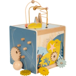 - De motorische activiteitenkubus “Seaside” heeft een overtuigende combinatie van natuurlijk hout en zachte trendy kleuren en afgeronde randen voor een aangenaam gevoel.