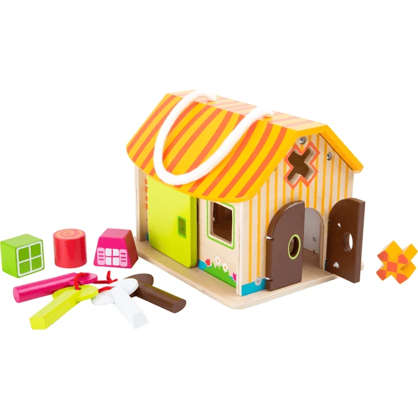 Elke sleutel past hier in een deur. De elastiekjes houden ze open wanneer ze worden geopend. De blokjes hebben ook verschillende vormen die in de juiste opening moeten worden geplaatst. Voor het transport wordt een koord gebruikt. Dit kleine houten huisje blijkt een motoriekspeeltje te zijn. Elke sleutel past hier in een deur.