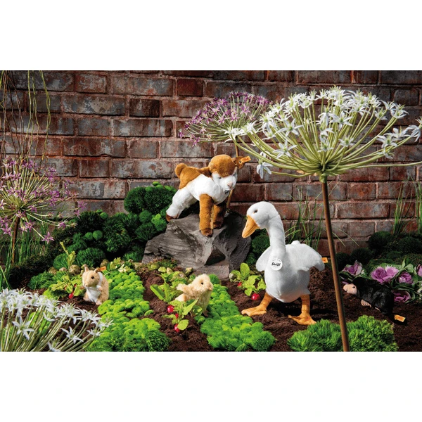 Zenzi geit staat met een grootte van 27 cm stabiel op haar poten. Dit wordt verzekerd door geïntegreerde draden. De basiskleuren van dit mooie beestje zijn bruin en wit en gemaakt van knuffelzacht geweven bont. Het hele lichaam is met behulp van de airbrushtechniek uitvoerig in roze en bruin geschilderd. Het kutje wordt in het bruin gehouden. De bruine hoorns staan grappig uit het hoofd.