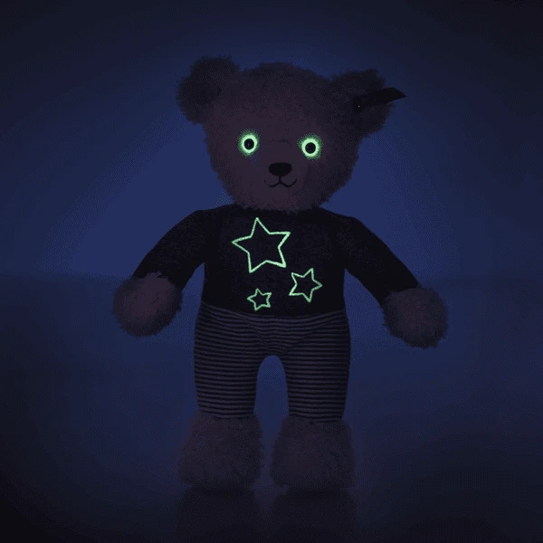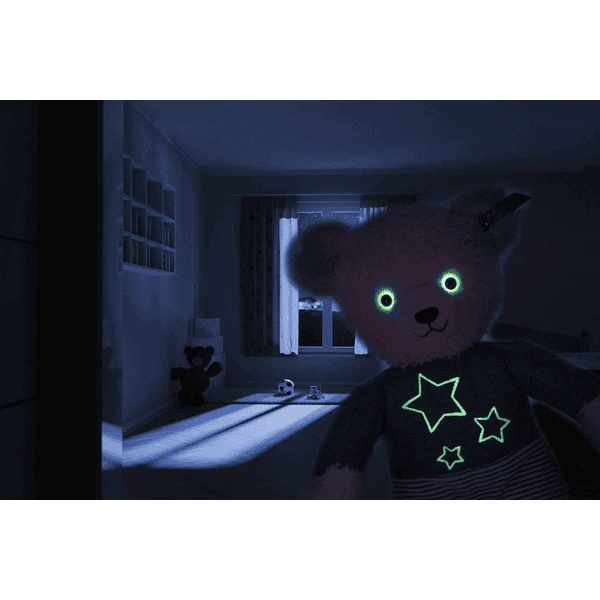 - Zijn ogen en de sterren geborduurd in glow-in-the-dark garen op zijn grijze en witte pyjama.