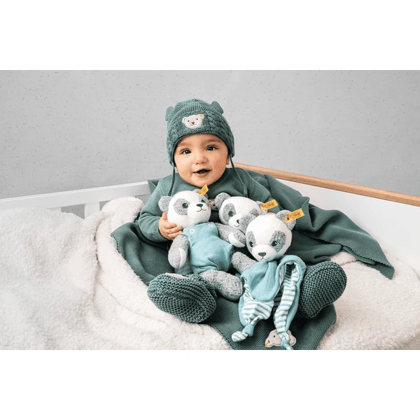 Het knuffeldoekje heeft een vingerpopfunctie, en de oren, ogen, neus en knopen op het doekje bieden speciale grijpeffecten. In Petrol , grijs en wit, legt Paco Panda de nadruk op een spannend spel van kleuren plus strepen.