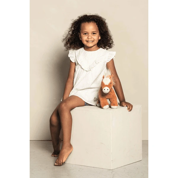De ruitvormige bles, mond, neusgaten en hoeven zijn gemaakt van beige pluche, manen en staart zijn analoog en wild.