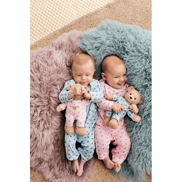 De kleine 25 cm hoge teddybeer in beige is gemaakt van pluche voor de babyzachte huid. Het neusje, de zolen en de poten zijn gemaakt van beige gekleurd zacht materiaal. De kleine zwarte berenneus en de lachende mond zijn in het zwart gegarneerd. De pyjama’s zijn roze met donkerroze geprinte sterren en geborduurde teddybeerkopapplicatie in beige. De pyjama kan worden uitgetrokken.