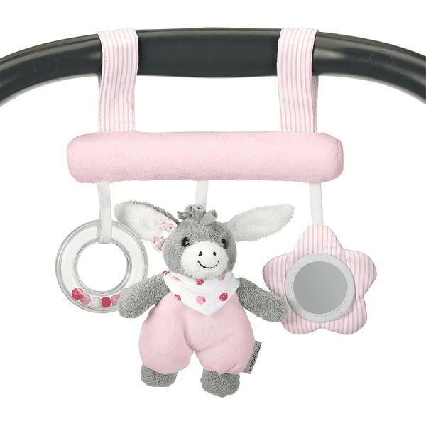 Met rammelaar. Met klitterband is het heel makkelijk te bevestigen.