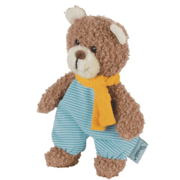 De mini-speelgoedbeer Ben van pluche, gestreepte jersey en relief jersey is een ideale metgezel voor je kleine lieveling. Met ingevoegde rammelaar in de kop.